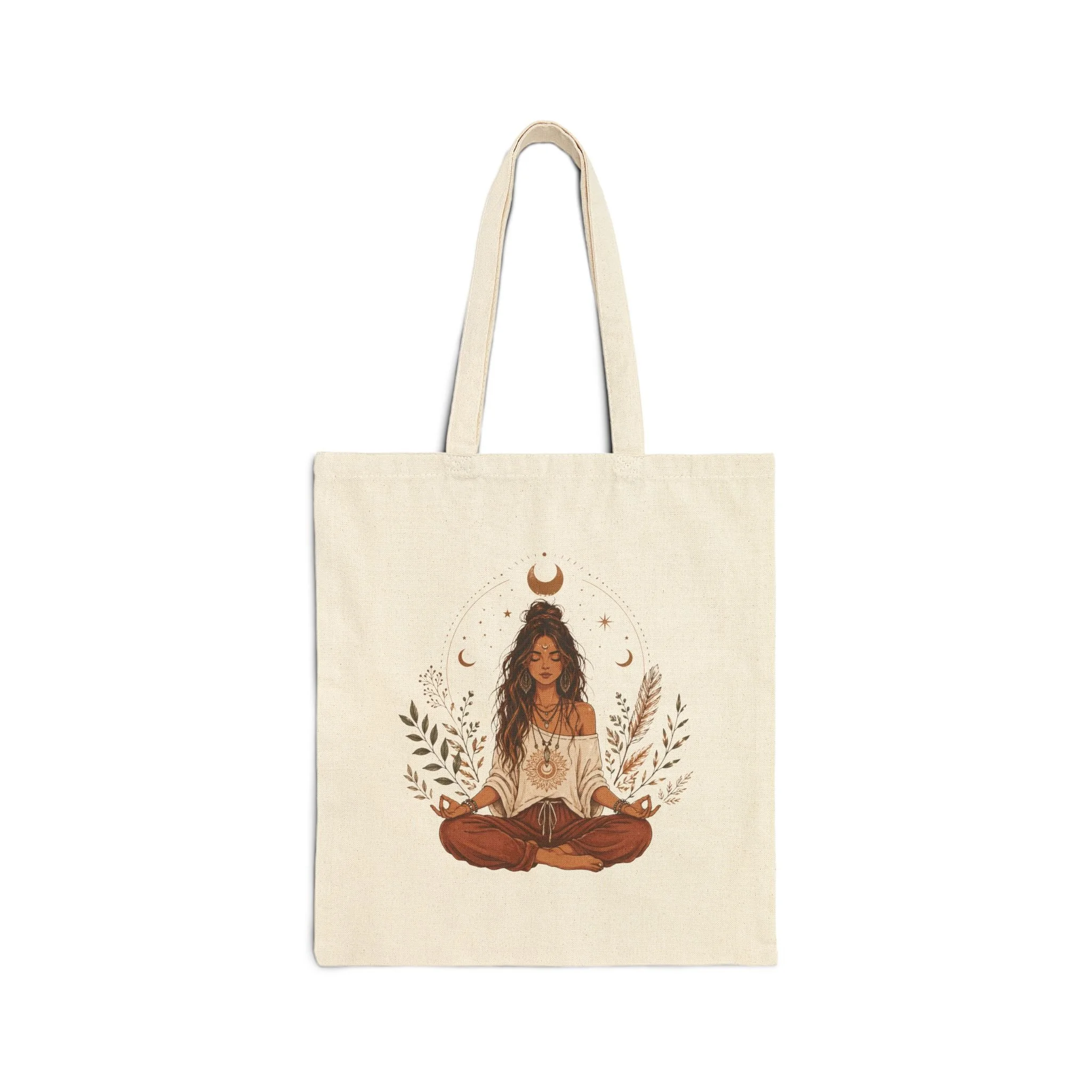 This cotton canvas tote brings calm energy to everyday errands. A warm, earthy illustration of a meditative figure surrounded by moon phases and soft foliage sits centered on a natural canvas background. The heavy 12 oz fabric and reinforced self-fabric handles feel substantial in hand, so the bag carries books, market finds, or a yoga mat with steady ease. The flat-corner construction keeps the silhouette neat and easy to fold into a purse or hang by the door. It’s the kind of tote that slips into a conscious routine: morning coffee runs, slow market Saturdays, and studio visits.